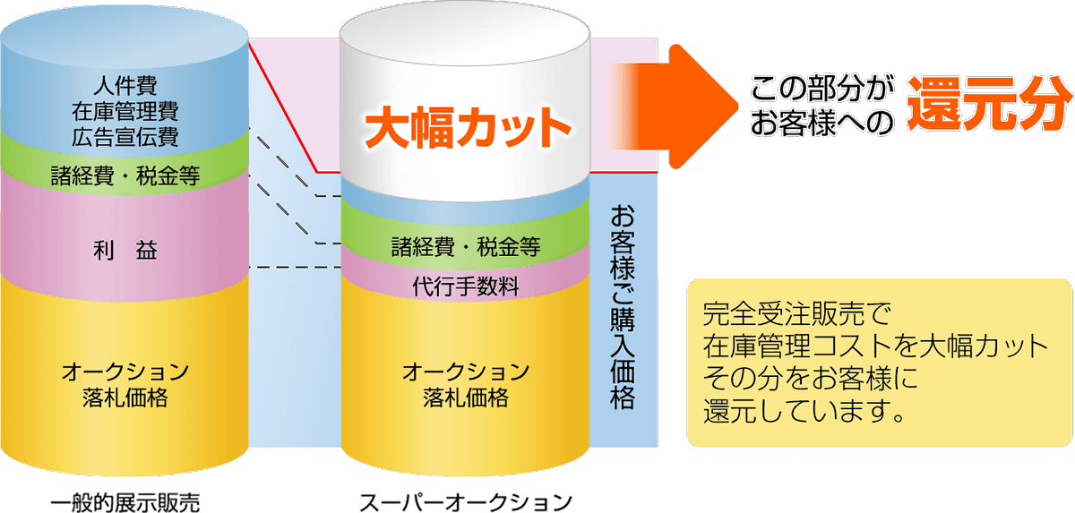 オークションの価格や情報をリアルタイムでお客様に公開する「ガラス張りの料金体系」で、運営しております。