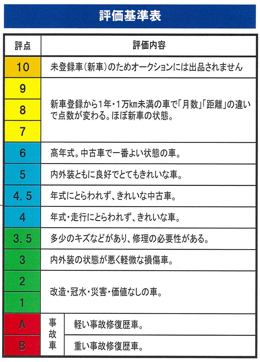 当社のスーパーオークションは「評価表」という一定の判断基準を設定し、内装・外装どちらも、だれから見ても優良な車輌であることを保証するための制度として取り入れております。